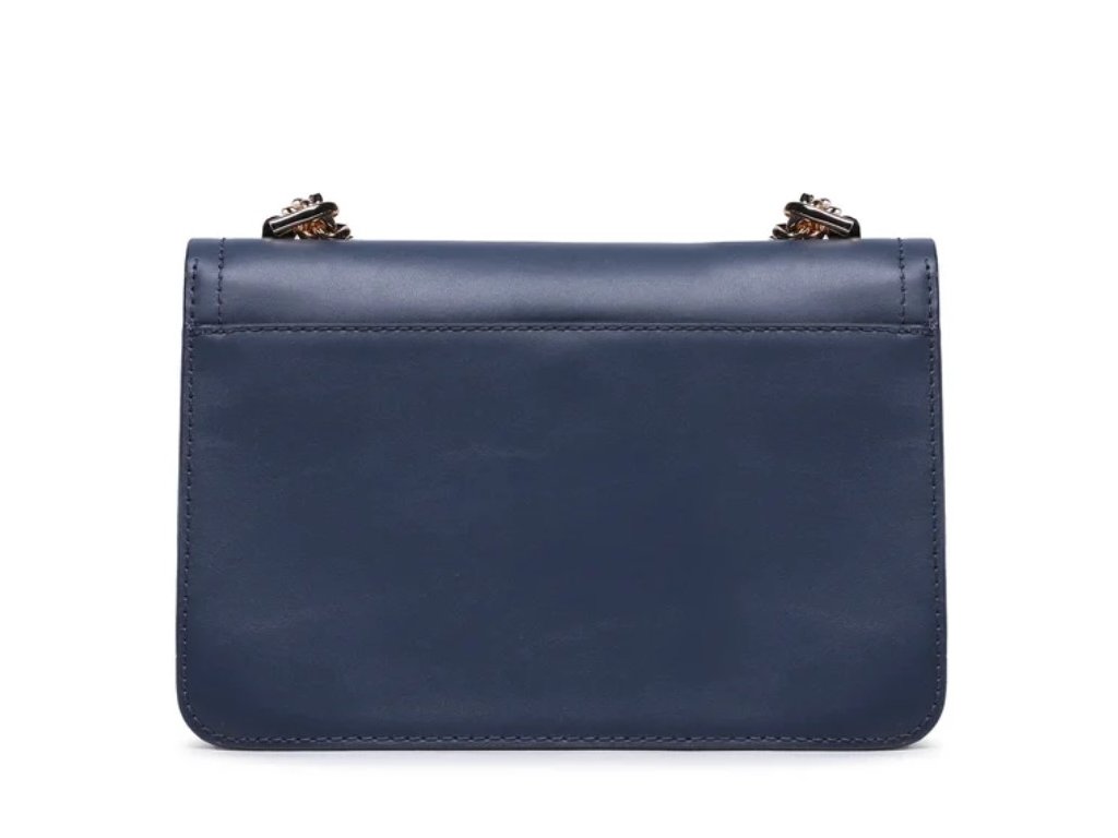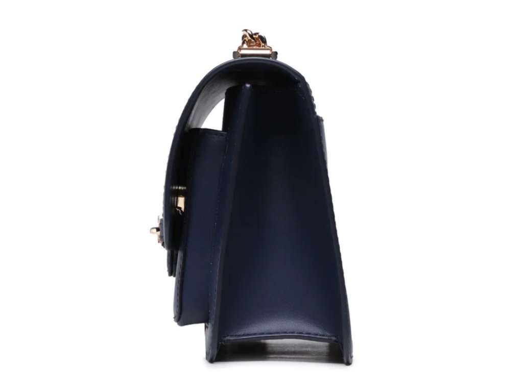 Rukojeť kabelky je tvořena zlatým řetízkem a páskem.